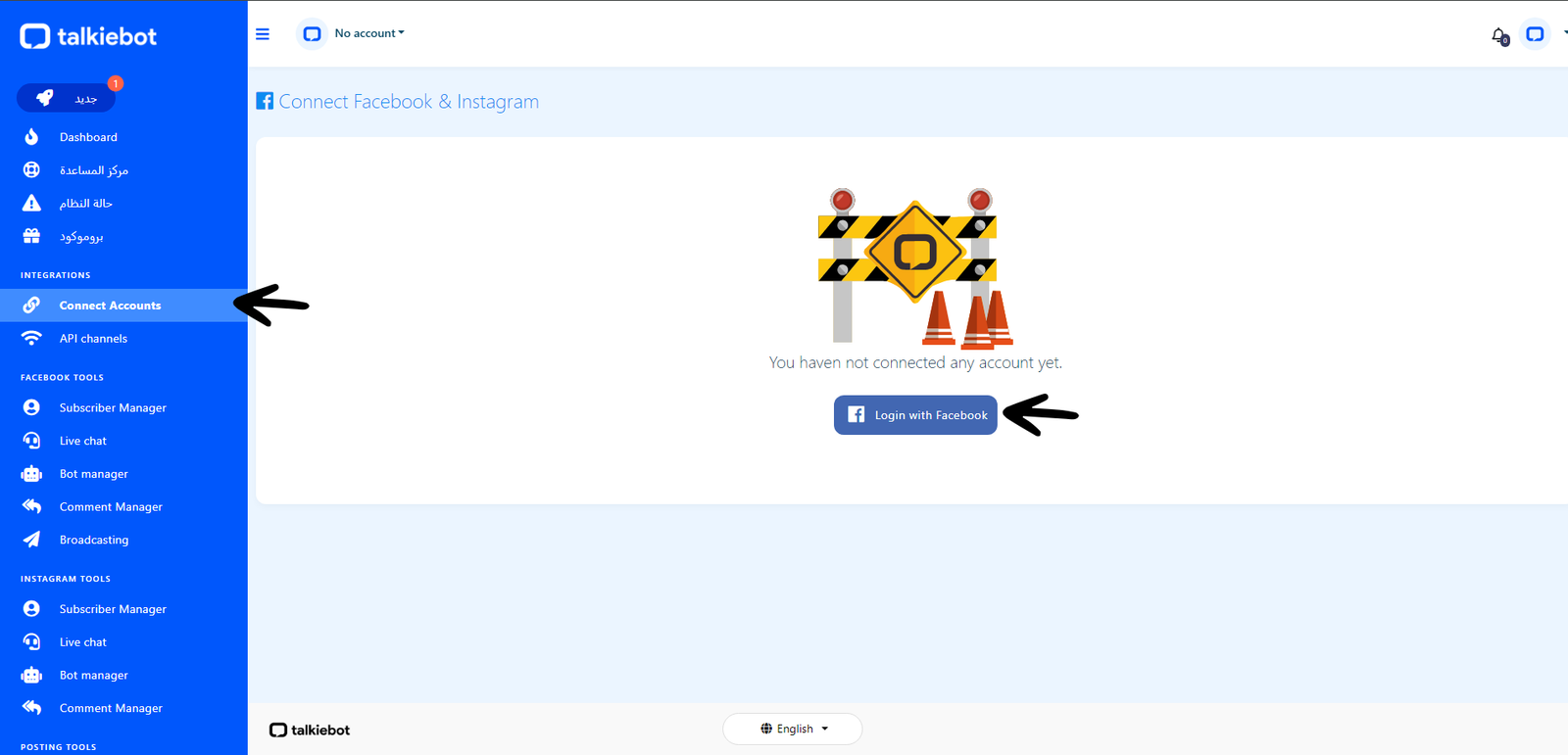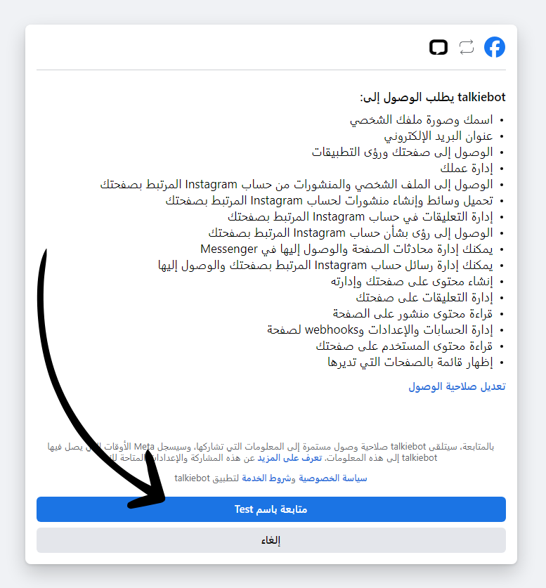 توصيل talkiebot مع الفيسبوك والانستجرام والماسنجر