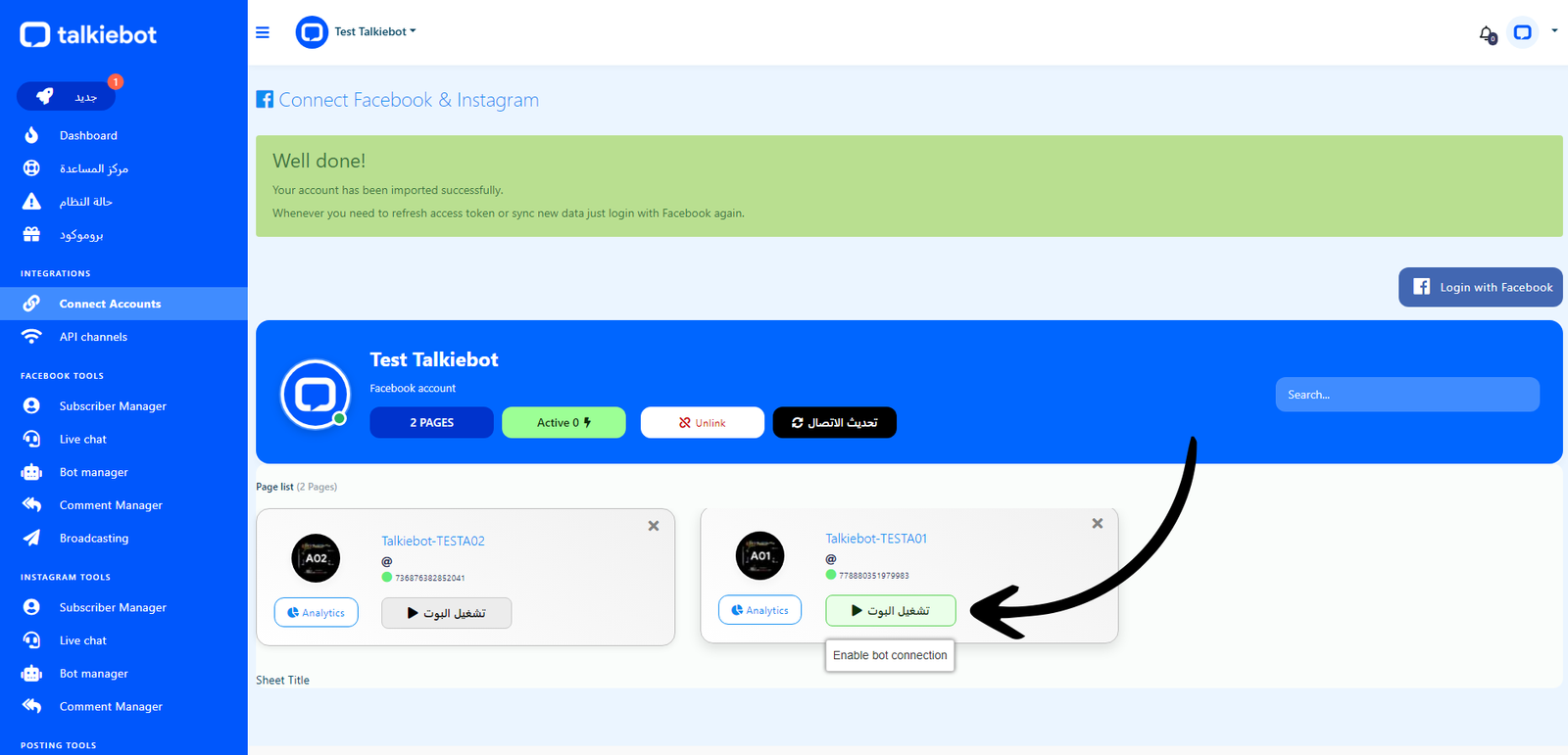 ستظهر الصفحات التي اخترتها في صفحة ربط الحسابات اضغط على تشغيل البوت لتمكين اتصال البوت